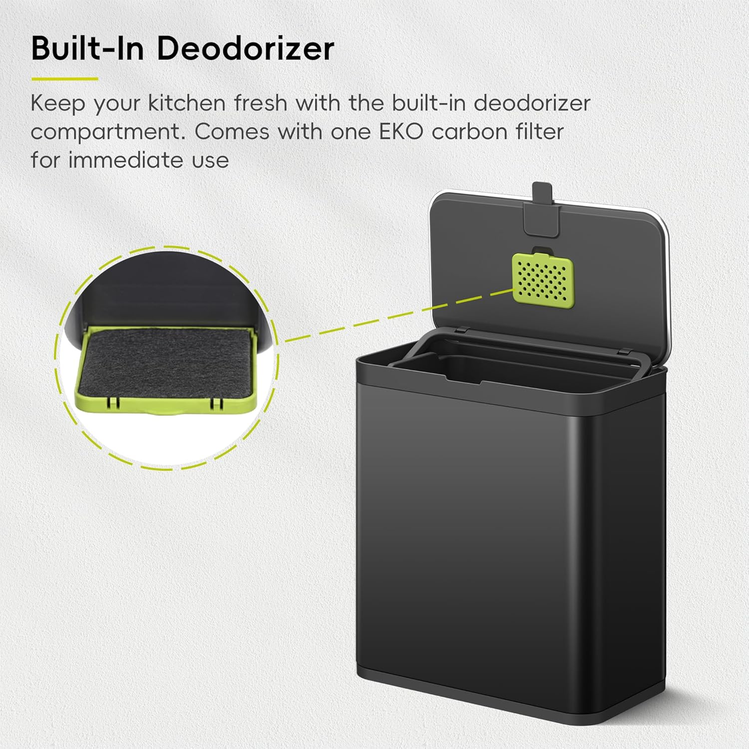 The EKO Kitchen Compost Bin is a sleek, 7L stainless steel food waste caddy designed for flexible placement—hang it on cabinet doors, mount on the wall, or set it on your countertop. Its dual-opening lid and wide mouth make disposing of kitchen scraps quick and mess-free, while a built-in deodorizer compartment with carbon filter locks in odors and keeps fruit flies at bay. Sturdy, fingerprint-resistant construction and a removable inner bucket ensure easy cleaning. With its compact, stylish design, the EKO Compost Bin is a must-have for any eco-friendly kitchen.