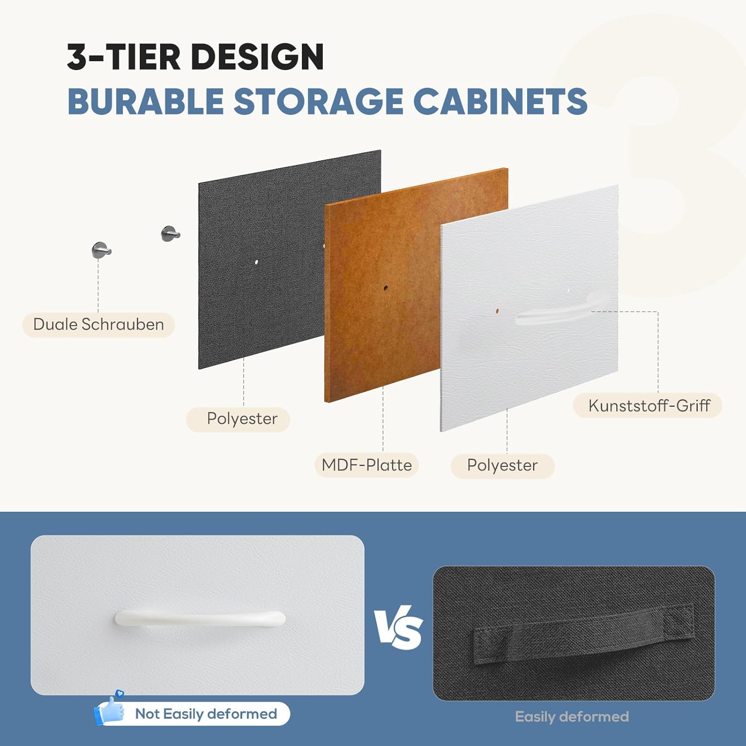 You can spot-clean the fabric drawers, but prolonged exposure to moisture may lead to wear. Replacement bins can be found from storage cabinet retailers. - How durable is the dresser organizer compared to a solid wood chest?