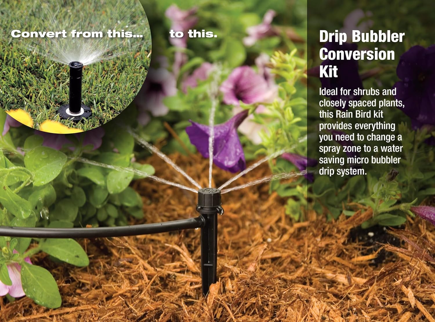 Upgrade your garden’s efficiency with the Rain Bird CNV182MBS Drip Irrigation Sprinkler Conversion Kit, designed to easily transform your existing 1800 Pop-Up sprinkler into a precise, water-saving drip micro bubbler system. This kit delivers targeted watering to flower beds and shrubs, minimizing weed growth while reducing water usage by up to 40%. With its easy installation—no digging required for Rain Bird 1800 series—plus a built-in pressure regulator, filter, and 6-port manifold, it’s a smart and eco-friendly solution for healthy, beautiful landscaping. Choose Rain Bird for reliable, pinpoint irrigation and a lush garden with less hassle.