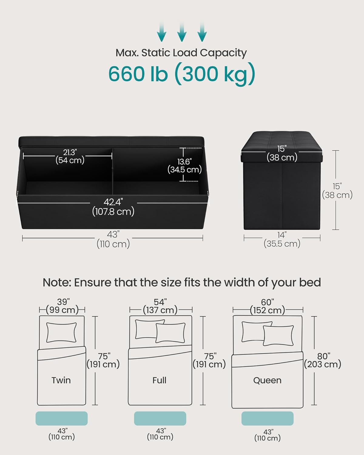 Users consistently praise this product for its blend of style and function. Its minimalist black design blends into bedroom or living spaces, while the high weight capacity ensures robust support as an entryway bench or living room storage solution.
