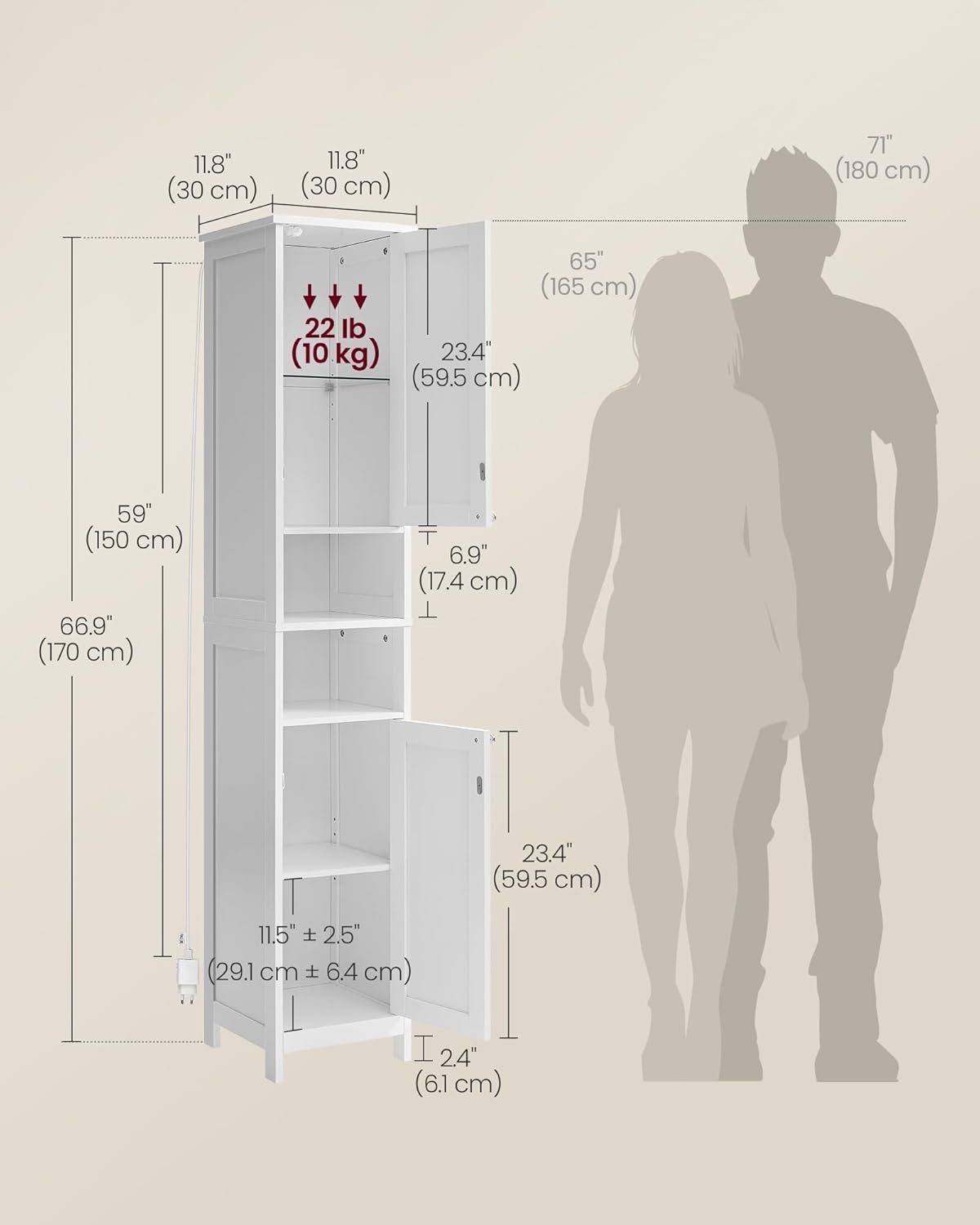 This model stands at 66.9 inches tall but takes up just 11.8 inches of floor space, making it a great choice for apartments or bathrooms lacking storage. The automatic door-activated LED lights make it easy to find items, while the clean Cloud White finish brings a fresh, minimal look to any room.